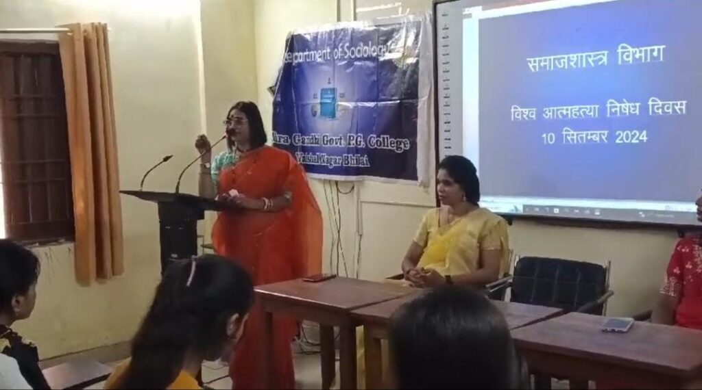 भिलाई. । इंदिरा गांधी की शासकीय स्नातकोत्तर महाविद्यालय वैशाली नगर के समाजशास्त्र विभाग द्वारा विश्व आत्महत्या निषेध दिवस का आयोजन किया गया। कार्यक्रम की अध्यक्षता प्राचार्य डॉ.अलका मेश्राम ने की। उन्होंने बच्चों के साथ रूबरू होकर उन्हें आत्महत्या के दुष्परिणामों की जानकारी दी। साथ ही साथ विद्यार्थियों में जीवन जीने की इच्छा को जागृत करते हुए उन्हें संदेश दिया।