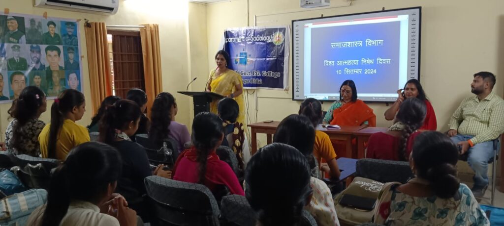 आत्महत्या की स्थिति तब निर्मित होती है जब व्यक्ति स्वयं को समाज के साथ सामंजस स्थापित नहीं कर पाता है और निराशावादी जीवन जीते हुए उसके मन में विचलन की स्थिति उत्पन्न होती है। आत्महत्या की ओर अग्रसर हो जाता है । विश्व आत्महत्या निषेध दिवस के अवसर पर अनेक छात्र-छात्राओं ने आत्महत्या के कारण को जाना उससे बचने के उपाय जाना तथा समाज में जीवन जीते हुए एक अच्छे नागरिक की भूमिका निभाते हुए यह संकल्प लिया कि अपने आसपास के वातावरण को खुशनुमा बनाते हुए अपने आसपास के किसी भी व्यक्ति को एकांत में पाए जाने पर उससे बातचीत करें और आत्महत्या को रोकने के प्रयास में समाजशास्त्र के विद्यार्थी अपनी अहम भूमिका निभाएंगे। कार्यक्रम में समाजशास्त्र के प्रथम द्वितीय एवं तृतीय वर्ष के अनेक छात्र-छात्राएं उपस्थित रहे।