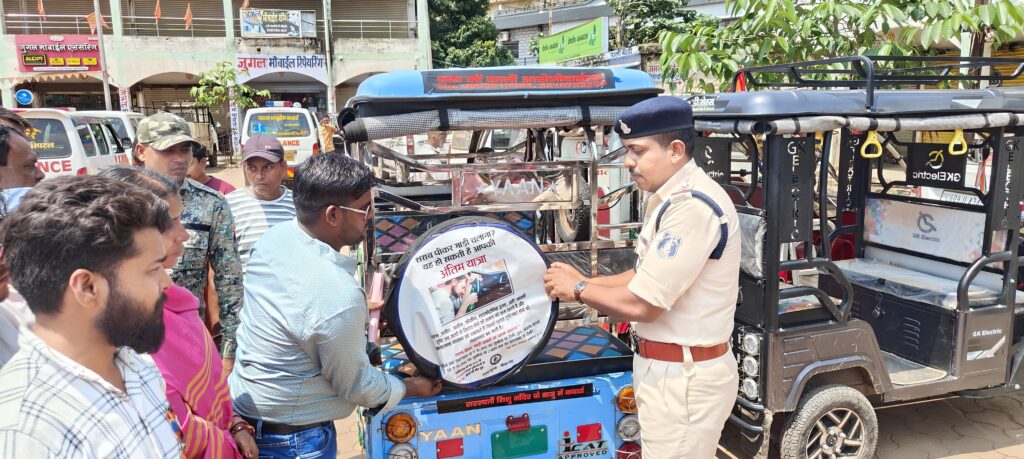 कवर्धा पुलिस अधीक्षक डॉ. अभिषेक पल्लव के निर्देशन एवं अतिरिक्त पुलिस अधीक्षक विकास कुमार , पुष्पेन्द्र बघेल एवं डीएसपी नक्सल ऑपरेशन श्री चंद्राकर के मार्गदर्शन में यातायात प्रभारी रक्षित निरीक्षक प्रवीण खलखो एवं यातायात टीम द्वारा सरदार वल्लभ भवन परिसर मेंऑटो रिक्शा चालकों का मीटिंग लेकर यातायात संबंधित महत्वपूर्ण जानकारी दिया गया इस दौरान पुलिस मुख्यालय रायपुर द्वारा प्राप्त यातायात जागरूकता ऑटो स्टेपनी वाइंडिंग को रिक्शा चालकों के दिया जाकर स्टेपनी में लगाया गया, यातायात प्रभारी श्री खलखों द्वारा ऑटो रिक्शा चालकों को सड़क के किनारे पार्किंग नहीं करने एवं व्यवस्थित रूप से अपना वाहन को खड़ी करने एवं शराब सेवन कर वाहन नहीं चलाने बताया गया ओव्हर स्पीड, वाहन चलाते समय मोबाईल मोबाइल का उपयोग नहीं करने एवं सड़क दुर्घटनाओं के संबंध में ऑटो रिक्शा चालकों को बताया गया।