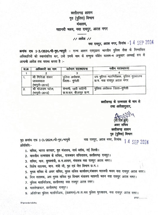 भोजराज पटेल अभी तक सेनानी, 15वीं वाहिनी छत्तीसगढ़ सशस्त्र बल, बीजापुर में तैनात थे। उनकी जगह गिरिजा शंकर जायसवाल मुंगेली पुलिस अधीक्षक के पद पर थे, जिन्हें अब पुलिस मुख्यालय में उप पुलिस महानिरीक्षक की जिम्मेदारी सौंपी गई है।