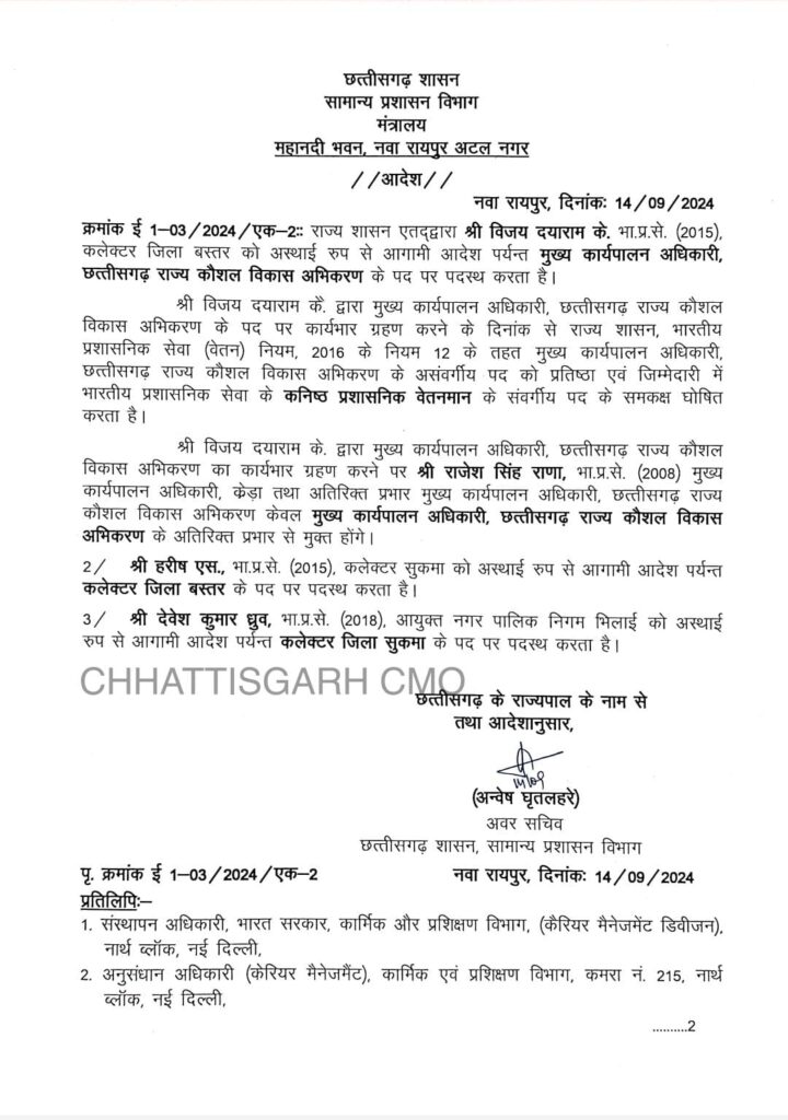 इसके अलावा, सुकमा कलेक्टर रहे हरीश एस को बस्तर कलेक्टर बनाया गया है, जबकि सुकमा कलेक्टर के रूप में देवेश कुमार ध्रुव की पदस्थापना की गई है। देवेश ध्रुव पहले भिलाई नगर निगम कमिश्नर के रूप में कार्य कर रहे थे।