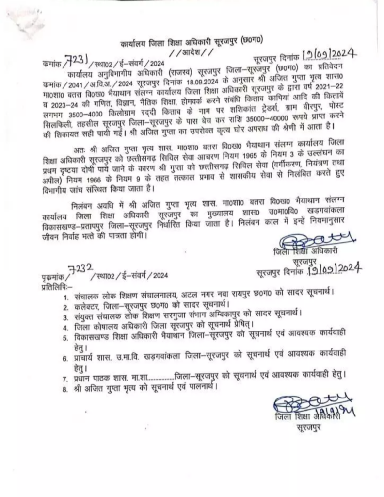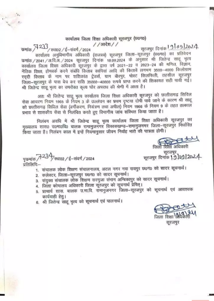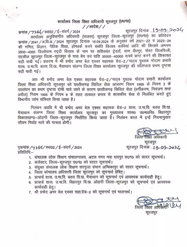 निलंबित किए गए कर्मचारियों में पाठ्यपुस्तक प्रभारी प्रमोद अमर बेल एक्का सहा. ग्रेड-2, सहयोगी अजित गुप्ता भृत्य और जितेन्द्र साहू भृत्य कार्यालय जिला शिक्षा अधिकारी सूरजपुर शामिल हैं। यह कार्रवाई अनुविभागीय अधिकारी सूरजपुर की जांच रिपोर्ट के आधार पर की गई है, जिसमें चोरी की पुष्टि हुई है और शिकायत सही पाई गई है।