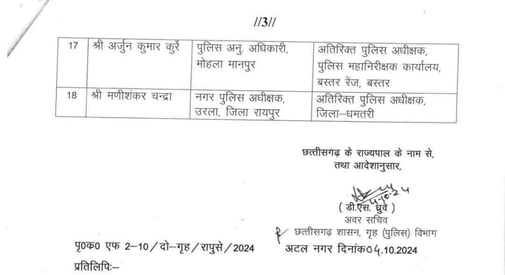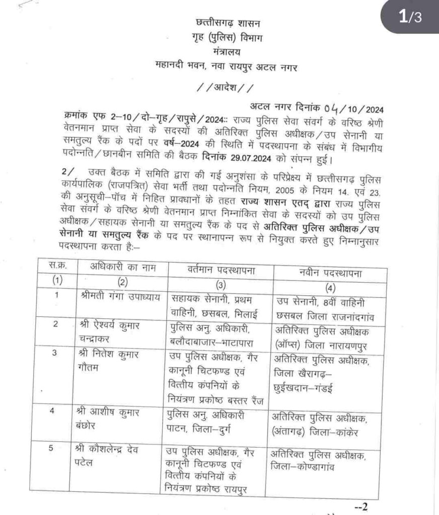महासमुंद डीएसपी कृष्णा कुमार पटेल को अतिरिक्त पुलिस अधीक्षक राज्य इन्वेस्टीगेशन एजेंसी पुलिस मुख्यालय में पदस्थ किया गया है, जबकि उदयन बेहार को उप पुलिस अधीक्षक बिलासपुर से एएसपी आसूचना शाखा, कांकेर कैम्प पुलिस उप महानिरीक्षक कांकेर की जिम्मेदारी दी गई है।