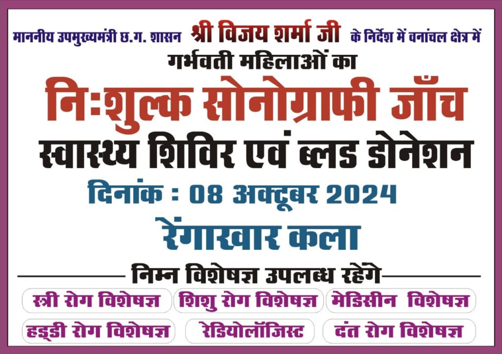 सूत्रों से प्राप्त जानकारी के अनुसार उपमुख्यमंत्री विजय शर्मा के निर्देश पर वनांचल क्षेत्र में गर्भवती महिलाओं के लिए निःशुल्क सोनोग्राफी जांच शिविर का आयोजन 07 अक्टूबर को तरेगांव जंगल, 08 अक्टूबर को रेंगाखार कला और 09 अक्टूबर को पिपरिया में किया जाएगा रेंगाखार कला में निःशुल्क सोनोग्राफी जांच शिविर के साथ साथ रक्तदान शिविर का भी आयोजन किया जाएगा इस शिविर में स्त्री रोग विशेषज्ञ, शिशु, मेडिसिन, हड्डी, दंत रोग विशेषज्ञ और रेडियोलोजिस्ट उपलब्ध रहेंगे यह शिविर गर्भवती महिलाओं के स्वास्थ्य के लिए महत्वपूर्ण है और इसमें विशेषज्ञ चिकित्सकों द्वारा सोनोग्राफी की सुविधा उपलब्ध कराई जाएगी सभी संबंधित महिलाएं इस अवसर का लाभ उठाएं ,उल्लेखनीय है कि प्रदेश में नई सरकार बनने के बाद मुख्यमंत्री विष्णुदेव साय के मंशानुरूप कबीरधाम जिले में स्वास्थ्य सुविधाओं का तेजी से सुधार एवं विस्तार हो रहा है जिले में महज पांच माह के भीतर ही सुरक्षित मातृत्व आश्वसन योजना के तहत जिले के 723 गर्भवती माताओं को निःशुल्क सोनोग्राफी का लाभ दिया गया है जिले के जिला अस्पताल कवर्धा और जिले के सामुदायिक स्वास्थ्य केन्द्र पंडरिया में बेहतर स्वास्थ्य सुविधाओं का विस्तार हुआ है साथ ही विशेषज्ञ चिकित्सकों की पदस्थापना राज्य शासन द्वारा की गई है उपमुख्यमंत्री विजय शर्मा द्वारा भी जिले में बेहतर स्वास्थ्य सुविधाओं के विस्तार तथा जरूरतमंद लोगों को सोनोग्राफी सुविधाओं का लाभ मिल सके इसके लिए जिला प्रशासन स्तर पर लगातार प्रयास किया जा रहा है जिले में निवासरत विशेष पिछड़ी जनजाति बैगा महिलाओं और ग्रामीणों की मांग पर जिले के सूदूर वनांचल क्षेत्र झलमला में मैगा कैंप लगाकर भी वनांचल क्षेत्र में निवासरत गर्भवती माताओं को विशेष स्वास्थ्य परीक्षण कर सोनोग्राफी की सुविधाएं मुहैया कराई गई