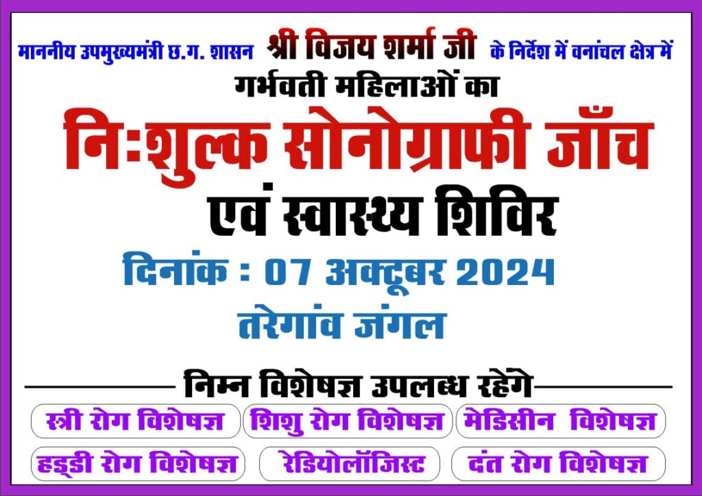 सत्येंद्र बडघरे कवर्धा – प्रदेश सरकार के उप मुख्यमंत्री व कवर्धा विधायक विजय शर्मा के निर्देश पर गर्भवती महिलाओं के लिए निःशुल्क सोनोग्राफी जांच एवं स्वास्थ्य शिविर का आयोजन किया गया है यह कार्यक्रम जिले के वनांचल क्षेत्र तरेगांव जंगल में