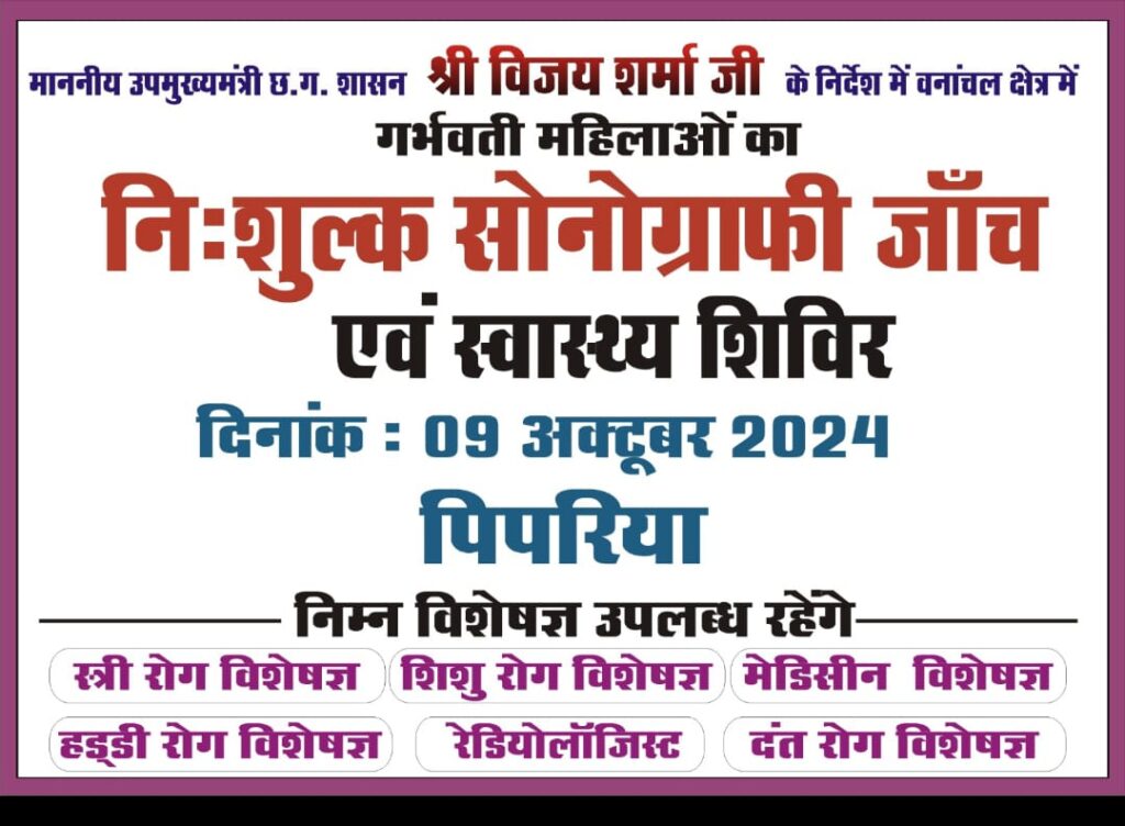 7 अक्टूबर को , 8 अक्टूबर को रेंगाखार कला और 09 अक्टूबर को नगर पंचायत पिपरिया निःशुल्क होगा।