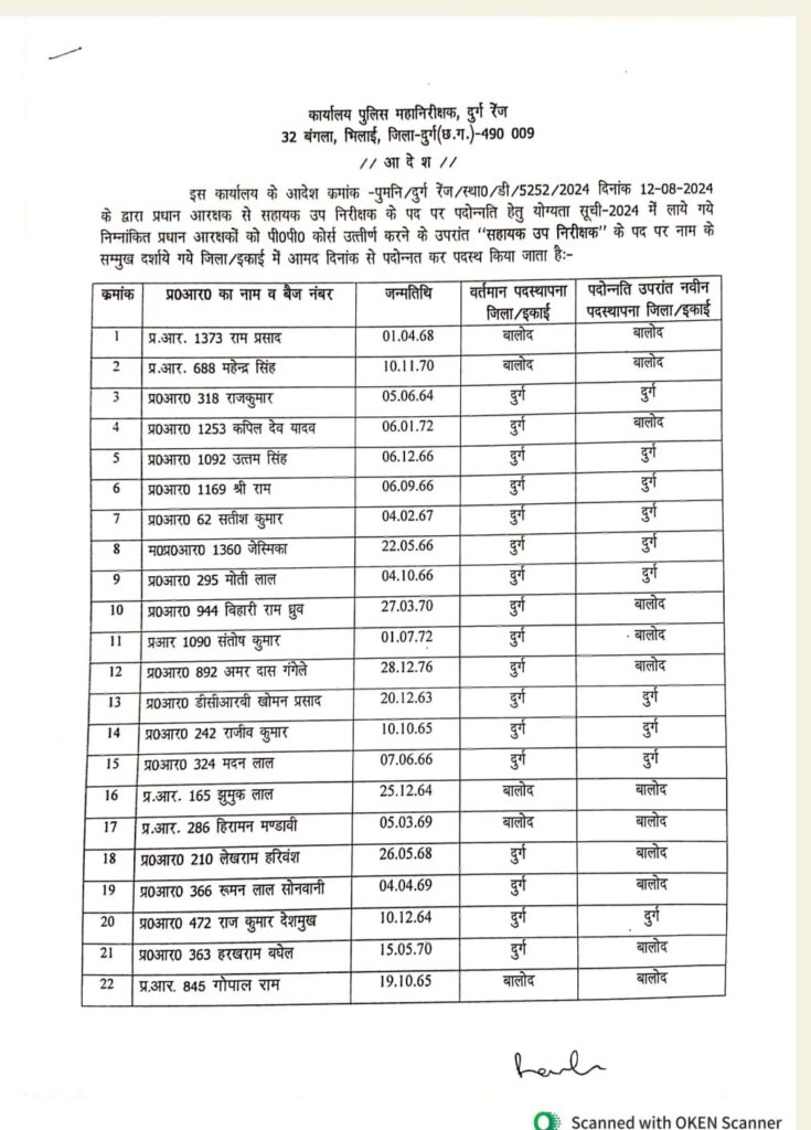 इस प्रमोशन प्रक्रिया के तहत दुर्ग जिले में 11, बालोद में 23 और बेमेतरा के 12 रिक्त पदों पर पुलिसकर्मियों की पोस्टिंग की गई है। जो कि पी. पी कोर्स करने के उपरांत सहायक उप निरीक्षक के पद से पदोन्नति कर पदस्थ किया जाएंगे।