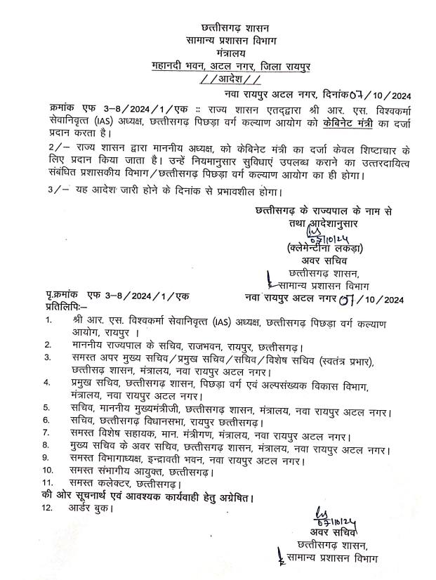 रायपुर । छत्तीसगढ़ सरकार ने राज्य के सेवानिवृत्त आईएएस अधिकारी आरएस विश्वकर्मा को कैबिनेट मंत्री का दर्जा प्रदान किया है। यह दर्जा उन्हें राज्य पिछड़ा वर्ग कल्याण आयोग के अध्यक्ष के रूप में दिया गया है।