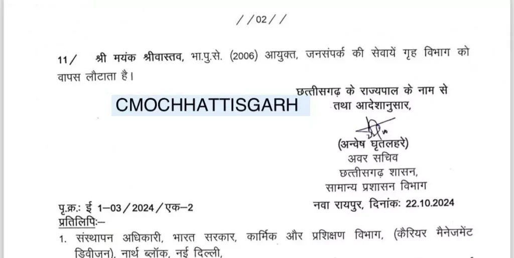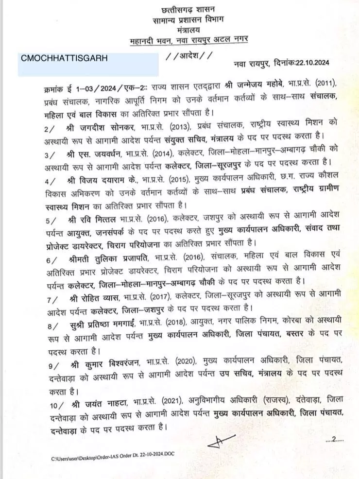 जन्मेजय महोबे को महिला बाल विकास विभाग का संचालक बनाया गया है। जगदीश सोनकर को बिना विभाग में मंत्रालय में पदस्थ किया गया है। विजय दयाराम को प्रबंध संचालक राष्ट्रीय ग्रामीण स्वास्थ्य मिशन बनाया गया है। प्रतिष्ठा ममगाई को बस्तर जिला पंचायत का सीईओ बनाया गया है। कुमार विश्वरंजन को उप सचिव मंत्रालय पदस्थ किया गया है। जयंत नाहटा को सीईओ जिला पंचायत दंतेवाड़ा पदस्थ किया गया है।