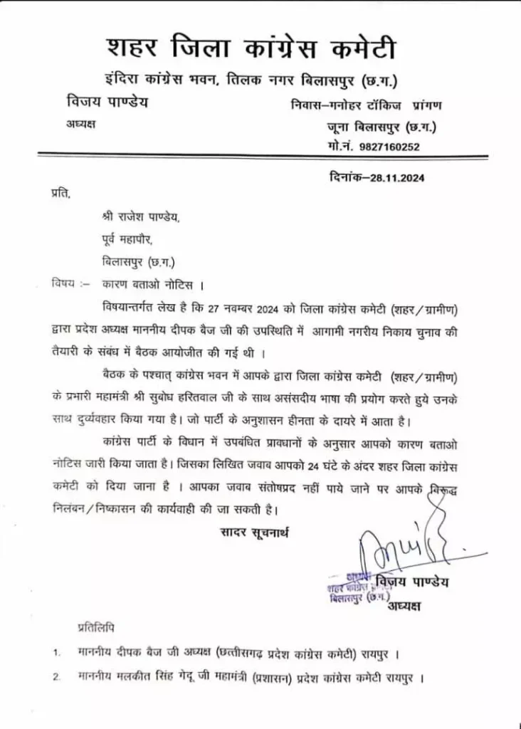 बिलासपुर । बिलासपुर में कांग्रेस की बैठक में जिला प्रभारी महामंत्री सुबोध हरितवाल और कांग्रेस नेता राजेश पांडे के बीच विवाद हो गया था। इस मामले में शहर जिला कांग्रेस कमेटी ने राजेश पांडे से 24 घंटे के भीतर जवाब मांगा है।
