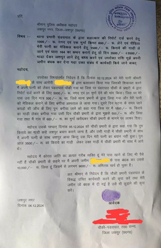 जशपुर । जशपुर जिले के पंडरापाठ चौकी क्षेत्र में एक दुष्कर्म पीड़िता के पति ने पुलिस अधीक्षक से लिखित शिकायत की है, जिसमें उन्होंने चौकी प्रभारी मानेश्वर राम साहनी पर रकम ऐंठने का आरोप लगाया है।