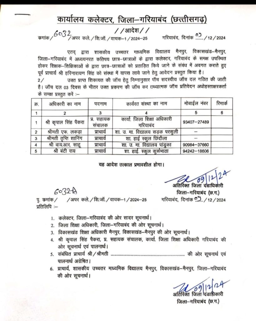 गरियाबंद । गरियाबंद के हायर सेकेंडरी स्कूल मैनपुर के छात्र-छात्राओं ने कलेक्ट्रेट पहुंचकर प्रभारी प्राचार्य और कुछ शिक्षक-शिक्षिकाओं पर प्रताड़ना का आरोप लगाया है। छात्रों ने आरोप लगाया है कि एक शिक्षक लंबे समय से दुर्व्यवहार कर रहा है और उन्होंने पूर्व प्राचार्य को संस्था में वापस लाने की मांग भी की है।