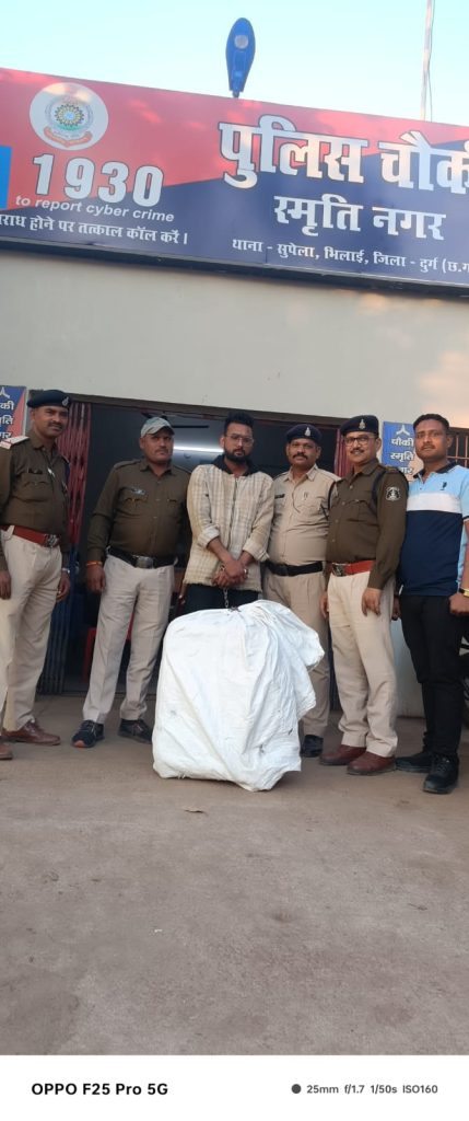 पुलिस अधीक्षक दुर्ग श्री जितेंद्र शुक्ला (भापुसे) एवं अतिरिक्त पुलिस अधीक्षक (शहर-भिलाई) श्री सुखनंदन राठौर के निर्देशन में दुर्ग पुलिस ने यह कार्रवाई की है। नगर पुलिस अधीक्षक भिलाई नगर, श्री सत्यप्रकाश तिवारी के मार्गदर्शन में थाना प्रभारी सुपेला श्री राजेश मिश्रा एवं चौकी प्रभारी स्मृति नगर श्री गुरूविन्दर सिंग संधु ने मुखबीर से प्राप्त सूचना के आधार पर एक व्यक्ति को गिरफ्तार किया है।