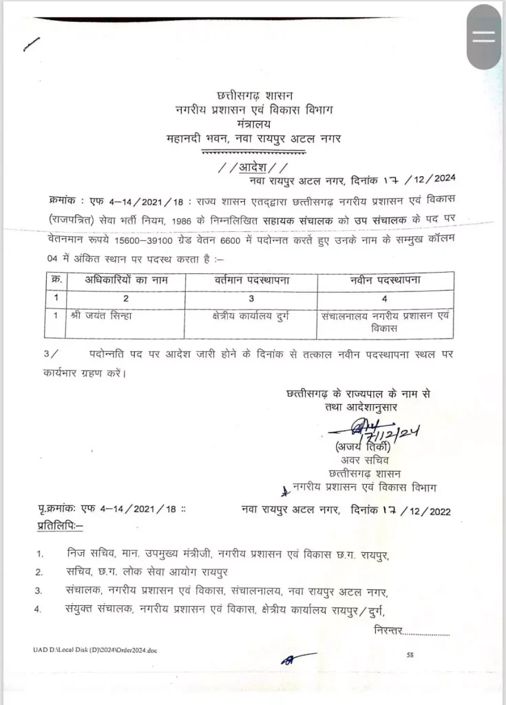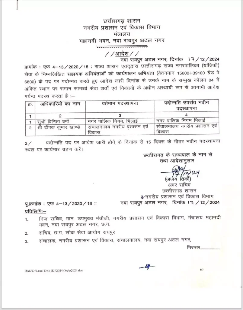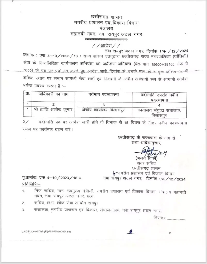 रायपुर । नगरीय प्रशासन विभाग ने अधिकारियों का प्रमोशन और पोस्टिंग आर्डर जारी किया है। इसमें सहायक संचालक को उप संचालक के पद पर प्रमोशन के साथ ही कार्यपालन अभियंता से अधीक्षण अभिंयता और सहायक अभियंता को कार्यपालन अभियंता के पद पर प्रमोशन दिया गया है।