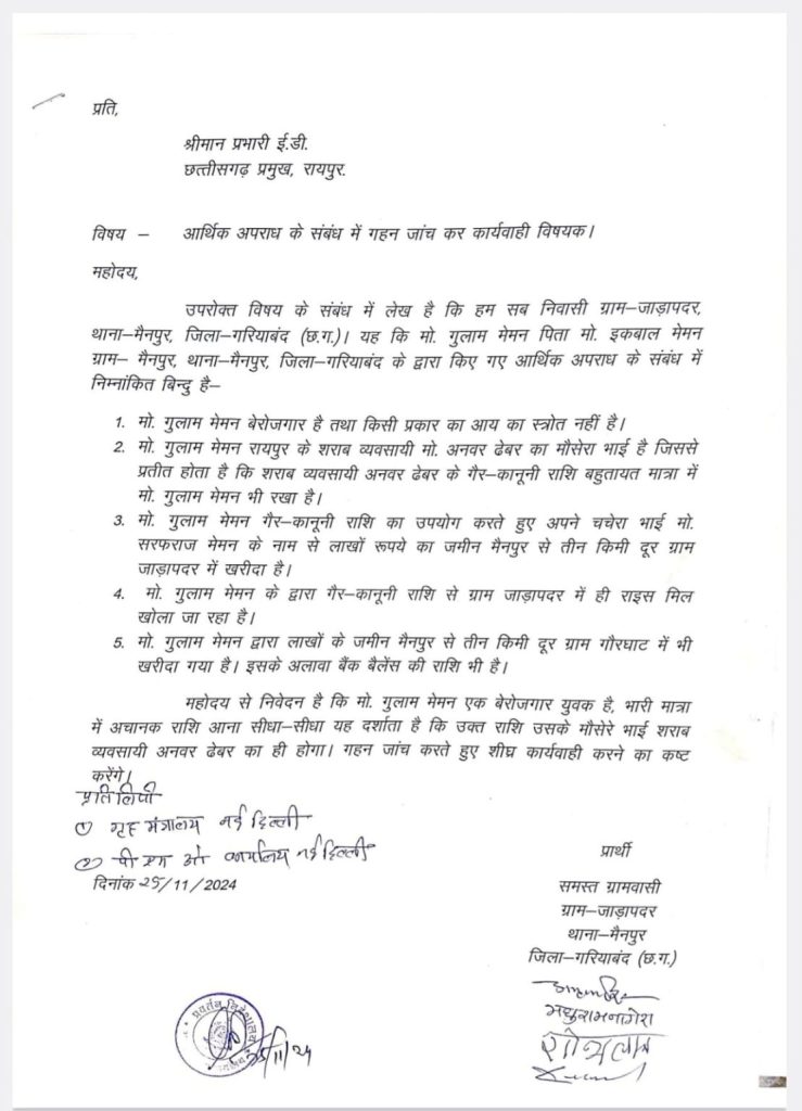 विवाद बढ़ने के पर ग्रामीणों ने ED के पास पहुंचकर एक लिखित शिकायत दर्ज कराई थी, जिसमें आरोप था कि बेरोजगार गुलाम मेमन द्वारा पिछले एक डेढ़ साल में मैनपुर में दो करोड़ से ज्यादा की संपति खरीदी गई है। शिकायत में गुलाम को चर्चित अनवर ढेबर का मौसेरा भाई बताया गया था। कहा जा रहा इसी शिकायत की पुष्टि के बाद आज ईडी की टिम ने छापामार कार्यवाही शुरू किया है।