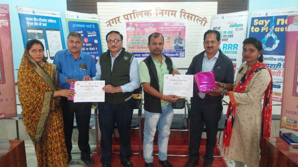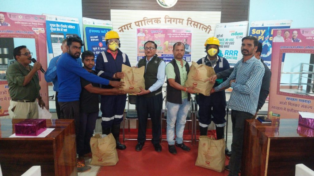 रिसाली । नगर पालिक निगम रिसाली के श्रेष्ठ कार्य करने वाले कर्मचारियों का सम्मान नेता प्रतिपक्ष शैलेन्द्र साहू ने किया। आयुक्त मोनिका वर्मा के मार्गदर्शन में स्वच्छता दूत को प्रमाण पत्र और उपहार दिया। स्वच्छता कमाण्डों को किट प्रदान किया गया। इस अवसर पर कार्यक्रम के मुख्य अतिथि शैलेन्द्र साहू ने नगरीय निकाय रिसाली में होने वाले विकास कार्य को विस्तार से बताया। योजनाओं को शहर के अंतिम छोर तक पहुंचाने के लिए कर्मचारियों को एक माध्यम बताया। कार्यक्रम में स्वच्छता दूत के अलावा उन प्रतिभागियों का भी सम्मान किया गया जिन्होंने इस पखवाड़ा में बेहतर प्रदर्शन किया है। इस अवसर पर कार्यपालन अभियंता एम.पी. देवांगन, जनस्वास्थ्य विभाग के प्रभारी अधिकारी बृजेन्द्र परिहार, प्रभारी उपअभियंता गोपाल सिन्हा, अमित चंद्राकर आदि उपस्थित थे। कार्यक्रम का संचालन चन्द्रपाल हरमुख ने किया।