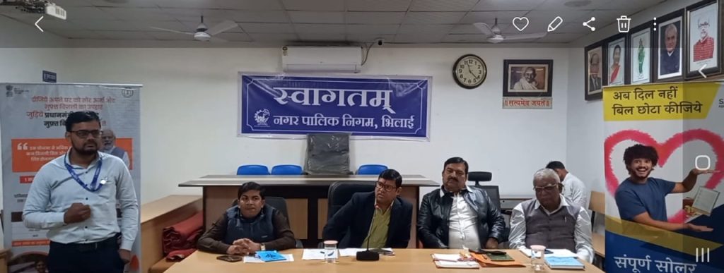 आयुक्त राजीव कुमार पाण्डेय एवं निगम के मुख्य अभियंता भागीरथी वर्मा, अधिक्षण अभियंता दीपक जोशी द्वारा अधिकारी कर्मचारियो की उपस्थिति में एजेंसी के सदस्यो से आवश्यक जानकारी प्राप्त की गई। जैसे- सोलर पैनल लगाने पर यदि अतिरिक्त बिजली बचता है तो क्या करेगें। इस पर एजेंसी द्वारा बताया गया कि सी.एस.ई.बी. बचत बिजली को अपने यहां स्टोर करेगी, जब भी व्यक्ति को आवश्यकता होगी उसे प्रदान किया जायेगा। सब्सिडी के साथ जो लगवायेगा उसे 7 प्रतिशत ब्याज द्वारा बैंको द्वारा लोन भी प्रदाय किया जायेगा। एजेंसी के सदस्य लोगो के बीच में जाकर इसके लाभ के बारे में बता रहे है।
