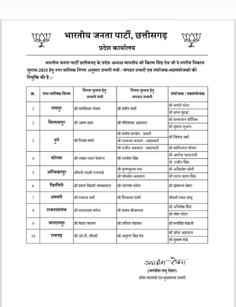 इसके अलावा, किसान नेता संदीप शर्मा को रायपुर नगर निगम का संगठन प्रभारी बनाया गया है, जबकि जयंती पटेल को संयोजक और छगनलाल मूंदड़ा को सह संयोजक की जिम्मेदारी दी गई है ¹।