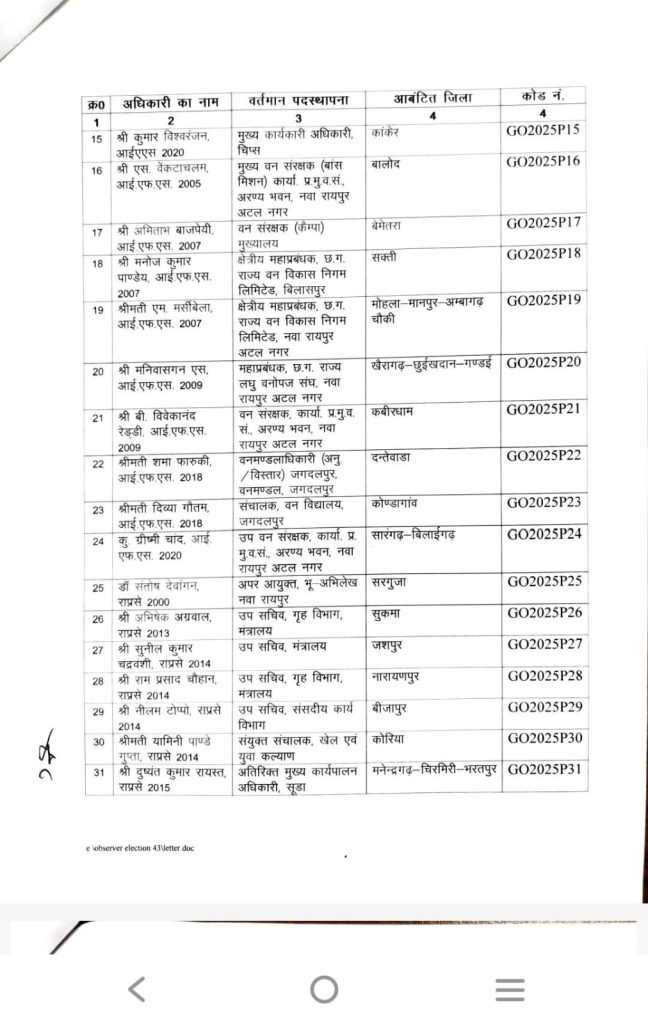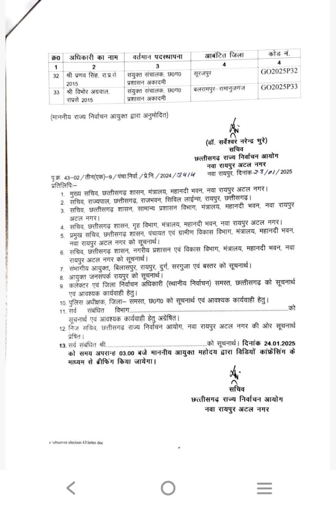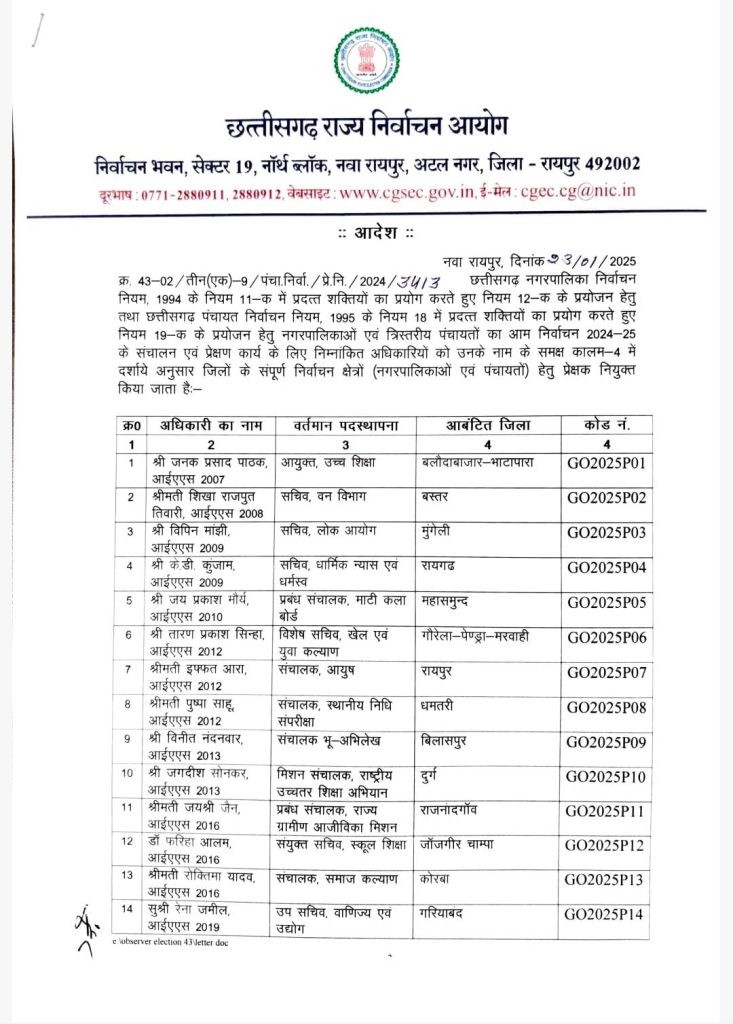 रायपुर । छत्तीसगढ़ में नगरीय निकाय और त्रिस्तरीय पंचायत चुनाव की तारीखें घोषित कर दी गई हैं। राज्य निर्वाचन आयोग ने अलग-अलग जिलों के लिए प्रेक्षकों की नियुक्ति की है।