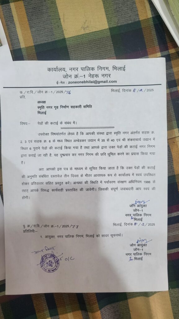जिससे निगम के छवि खराब हो। प्राप्त जानकारी के अनुसार समिति के जानकारी में ही हरे भरे पेड़ों को काटा गया है जिसमें शासन द्वारा प्रतिबंधित नीम, आम, जामुन, करंज आदि बड़े-बड़े पेड़ों को काट दिया गया है। जिसकी शिकायत स्मृति नगर के निवासी कलेक्टर जिला दुर्ग सुश्री रिचा प्रकाश चौधरी से किये थे। जिसके कारण नगर निगम भिलाई ने समिति के खिलाफ स्मृति नगर थाने में एवं वन विभाग में समिति के प्रति कार्रवाई करने के लिए शिकायत की। आज निगम के सहायक राजस्व अधिकारी प्रसन्न तिवारी स्वयं जाकर के नोटिस का तमिल करवा करवाए।