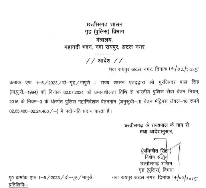 रायपुर । छत्तीसगढ़ सरकार ने आईपीएस अधिकारी गुरजिन्दर पाल सिंह (जीपी सिंह) को पुलिस महानिदेशक (डीजीपी) वेतनमान में पदोन्नति दी है ¹। गृह विभाग ने इस संबंध में आदेश जारी किया है, जिसमें कहा गया है कि उन्हें 02 जुलाई 2024 से प्रभावी रूप से भारतीय पुलिस सेवा वेतन नियम, 2016 के तहत वेतन मेट्रिक्स लेवल 16 (₹2,05,400 – ₹2,24,400) में पदोन्नत किया गया है।