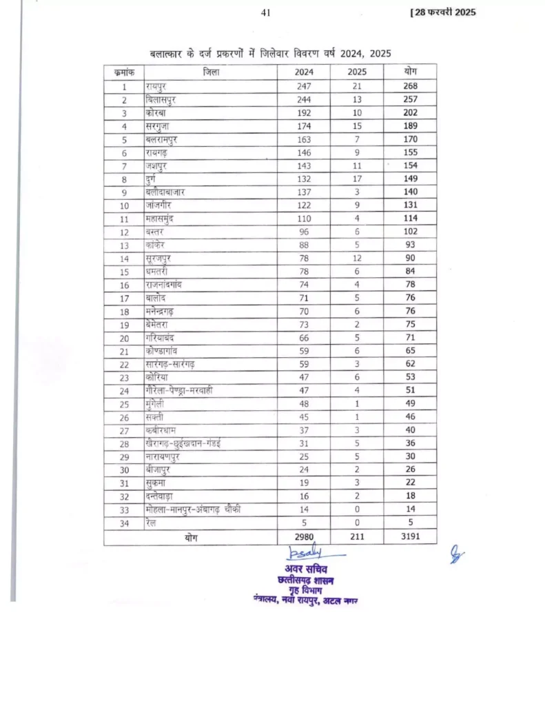 उमेश पटेल के सवालों पर जवाब देते हुए गृह मंत्री विजय शर्मा ने बताया कि रायगढ़ जिला हत्या के मामले में तीसरा, लूट में पांचवा, अपहण में दसवां, चोरी में पांचवा, डकैती में पांचवा और बलात्कार के मामले में छठवें स्थान पर है। वहीं, बात करें पूरे प्रदेश की तो छत्तीसगढ़ में साल 2024 से 2025 के बीच हत्या के 1114, लूट के 458, अपहरण के 3644, चोरी के 7960, डकैती के 56 और बलात्कार के 3191 मामले दर्ज किए गए हैं।