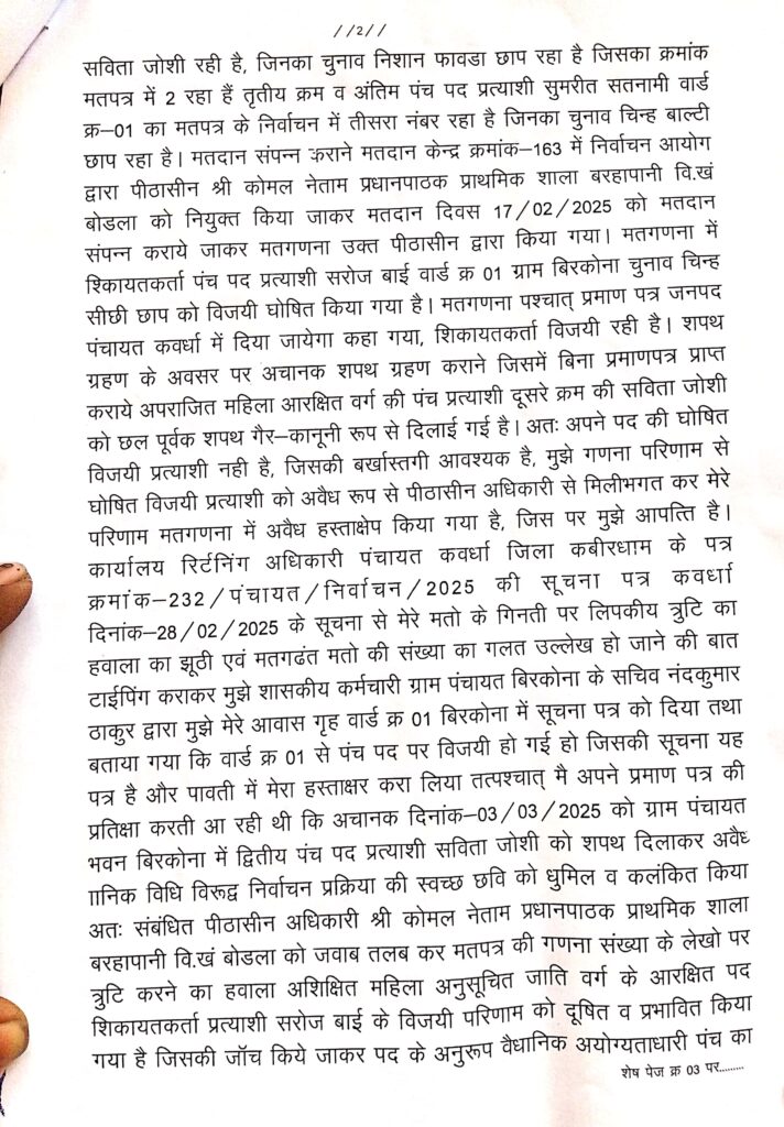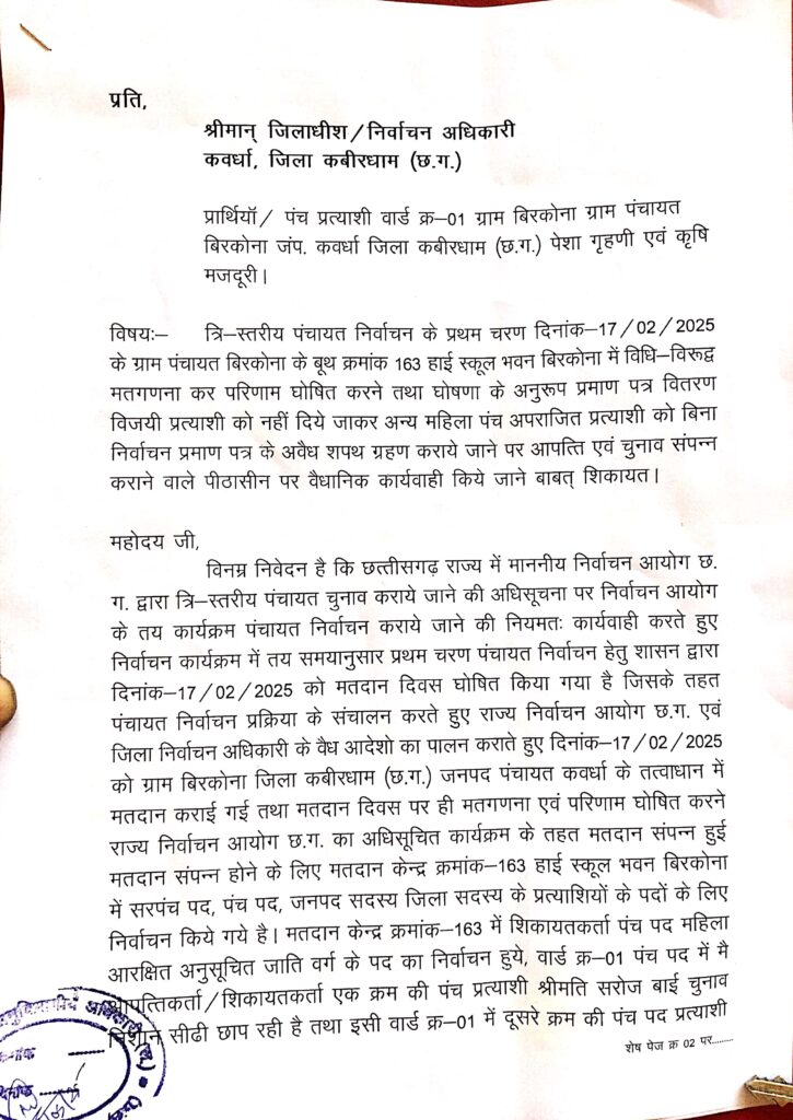 सत्येन्द्र बडघरे कवर्धा – जिला मुख्यालय कबीरधाम से महज दस किलोमीटर दूर ग्राम पंचायत बिरकोना में वार्ड नंबर एक की महिला पंच प्रत्याशी व उसके पति ने ग्राम के सचिव व पीठासीन अधिकारी पर गंभीर आरोप लगाया है महिला पंच प्रत्याशी सरोज बाई और उसके पति ने मीडिया को बताया कि उन्हें चुनाव में मतगणना के दौरान जीत बताई गई थी, परिवार में वैवाहिक कार्यक्रम के कारण उक्त महिला ग्राम से बाहर थी इस कारण उन्हें प्रमाण पत्र व मतगणना पत्र नहीं मिला था परंतु महज तीन-चार दिन पहले स्थानीय पंचायत सचिव व एक अन्य व्यक्ति उसके घर पर आए और धोखे से एक लेटर पर उनके हस्ताक्षर लिए महिला ज्यादा पढ़ी-लिखी नहीं है और उसके घर पर भी कोई नहीं था सचिव ने उक्त महिला को कहा कि हस्ताक्षर के बाद उन्हें चुनाव में जीत का प्रमाण पत्र दिया जाएगा परंतु बाद में उक्त महिला को पता चला कि कोई अन्य प्रत्याशी चुनाव जीत गया है अब सरोज बाई और उसका पति असमन जोशी न्याय की मांग कर रहे हैं और मामले की शिकायत उन्होंने जिला निर्वाचन अधिकारी से की है अब देखना यह है कि क्या सरोज बाई को निर्वाचन अधिकारी से इंसाफ़ मिलेगा या फिर निर्वाचन विभाग भी गांधी जी के बताए फार्मूले को स्तेमाल करते हुए नजर आएगी।