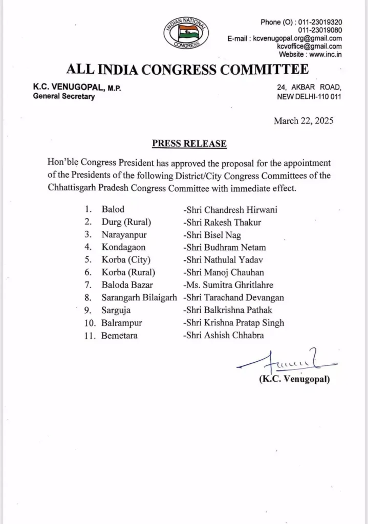 कांग्रेस ने छत्तीसगढ़ में 11 जिला अध्यक्षों की नियुक्ति की