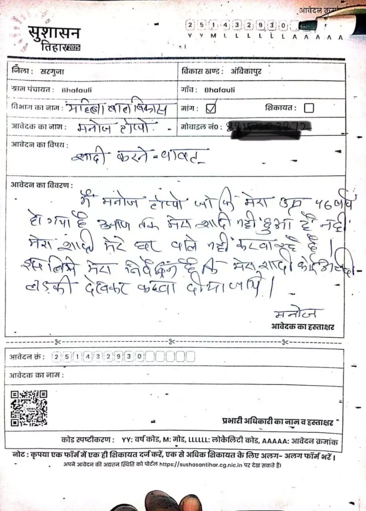 सुशासन तिहार के दौरान इस तरह के कई अनोखे आवेदन सामने आ रहे हैं, जिन्हें पढ़कर अधिकारी भी हैरान हो रहे हैं। मनोज टोप्पो का आवेदन भी उनमें से एक है, जिसने सबका ध्यान आकर्षित किया है।