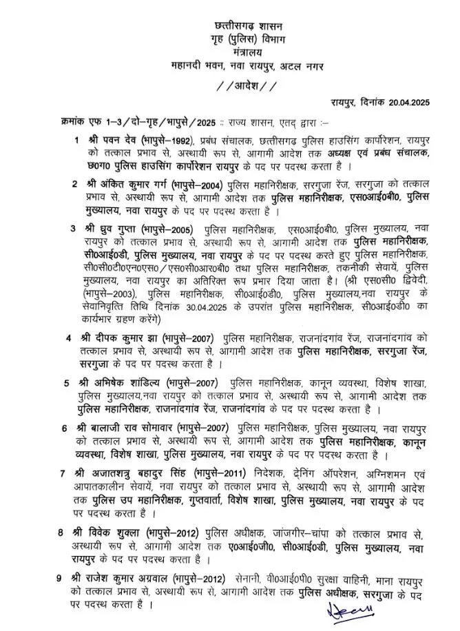 छत्तीसगढ़ में बड़ा प्रशासनिक फेरबदल, 20 आईपीएस अधिकारियों के तबादले