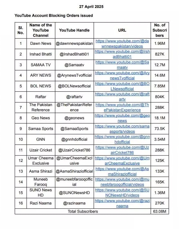 दिल्ली । भारत सरकार ने जम्मू-कश्मीर में हुई पहलगाम आतंकी घटना के बाद पाकिस्तान के खिलाफ बड़ा एक्शन लिया है। गृह मंत्रालय की सिफारिशों पर, भारत सरकार ने 16 पाकिस्तानी यूट्यूब चैनलों पर प्रतिबंध लगा दिया है, जिनमें डॉन न्यूज, समा टीवी, जियो न्यूज जैसे प्रमुख न्यूज चैनल शामिल हैं।