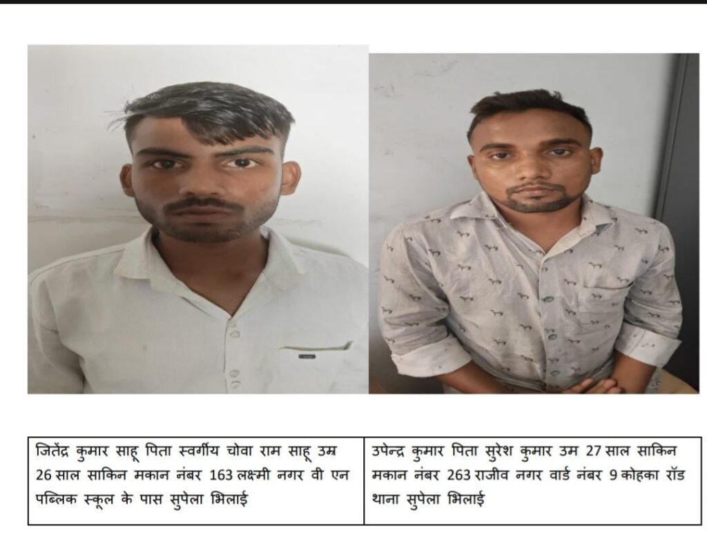 - जितेन्द्र कुमार साहू, उम्र 26 वर्ष, निवासी 163 लक्ष्मी नगर, वी.एन. पब्लिक स्कूल के पास, सुपेला, भिलाई