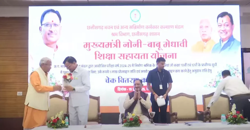 रायपुर । छत्तीसगढ़ के मुख्यमंत्री विष्णुदेव साय ने न्यू सर्किट हाउस में आयोजित कार्यक्रम में मुख्यमंत्री नोनी बाबू मेघावी शिक्षा सहायता योजना के तहत बोर्ड परीक्षा में कक्षा दसवीं और बारहवीं के टॉप 10 में आए पंजीकृत श्रमिकों के कुल 31 मेधावी छात्र-छात्राओं को प्रोत्साहन राशि प्रदान की।