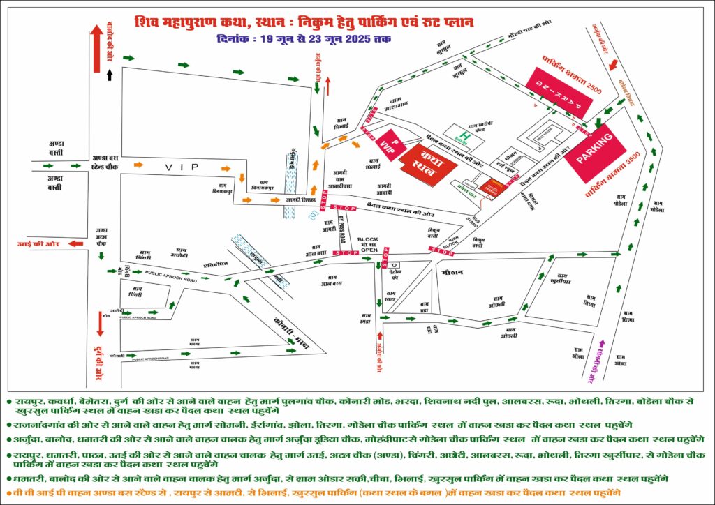 अण्डा बस स्टैंड – विनायपुर – आमटी तिराहा – भिलाई – वीवीआईपी पार्किंग स्थल कथा स्थल के पास।