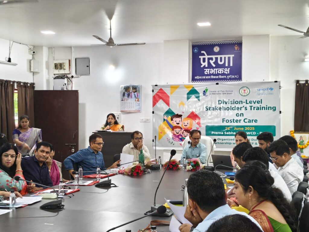 दुर्ग, । कलेक्टर श्री अभिजीत सिंह के मार्गदर्शन में 26 जून 2025 को महिला एवं बाल विकास विभाग कार्यालय दुर्ग के प्रेरणा सभाकक्ष में जिला बाल संरक्षण इकाई द्वारा सेंटर ऑफ एक्सीलेंस इन अल्टरनेटिव केयर के सहयोग से पोषण देखरेख (फॉस्टर केयर) विषय पर संभाग स्तरीय कार्यशाला आयोजित की गई। महिला एवं बाल विकास अधिकारी से प्राप्त जानकारी के अनुसार उक्त प्रशिक्षण में राज्य में संचालित पोषण देखरेख कार्यक्रम (फॉस्टर केयर प्रोग्राम) अंतर्गत उमंग कार्यक्रम के प्रभावी कियान्वयन हेतु हितधारकों की क्षमता संवर्धन हेतु प्रशिक्षक के रूप में राज्य से डॉ रामचरण चौकसे, कार्यक्रम प्रबंधक, राज्य दत्तक ग्रहण संसाधन अभिकरण नवा रायपुर, यूनिसेफ से सीईएसी डॉ. वसुधरा, मैनेजिंग ट्रस्टी, श्री हितेश कुमार, सोना बर्सन, राज्य प्रोग्राम मैनेजर, फॉस्टर केयर, एवं राहुल जेमा उपस्थित रहें।