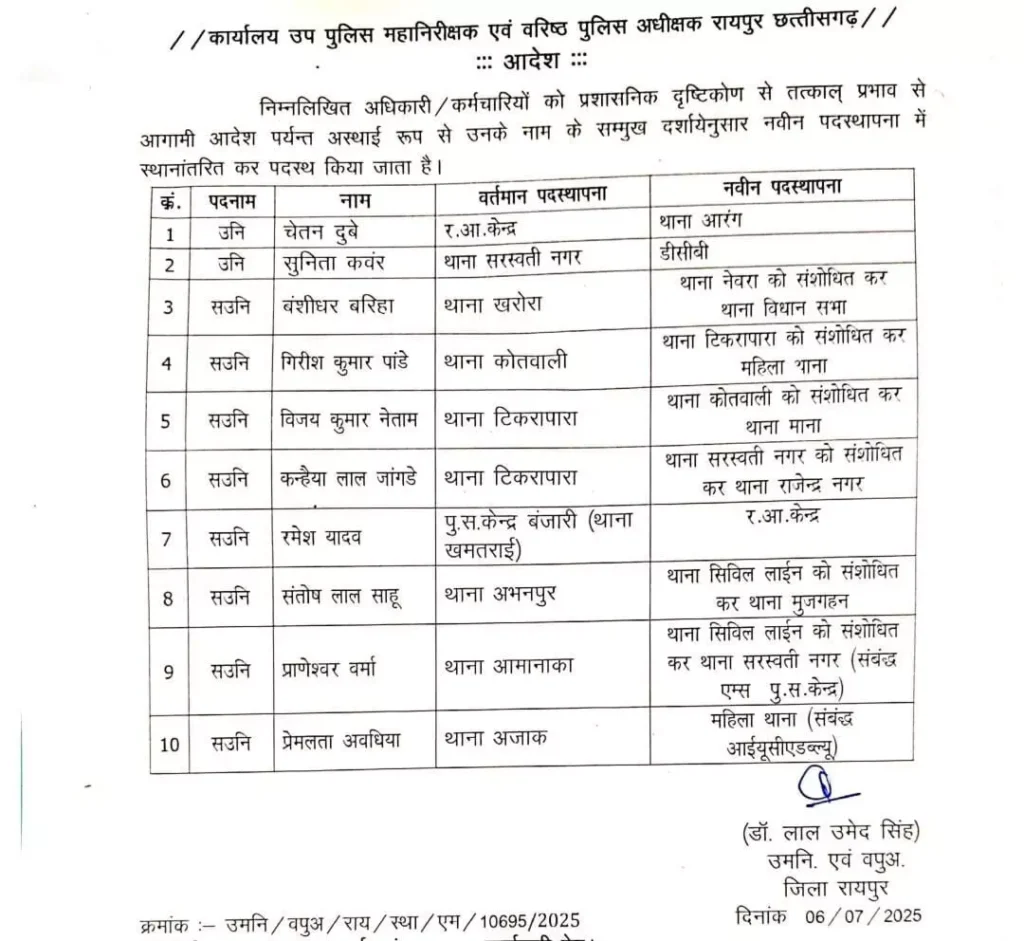 रायपुर । रायपुर जिले में 10 पुलिस अधिकारियों का तबादला किया गया है। वरिष्ठ पुलिस अधीक्षक डॉ. लाल उमेंद सिंह द्वारा इस संबंध में आदेश जारी किया गया है।