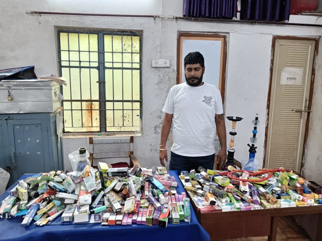 अभियान के तहत मोहन नगर थाना क्षेत्र अंतर्गत स्टेशन रोड दुर्ग स्थित एसएसडी डेली निड्स दुकान में संचालक रोहित जसवानी (34 वर्ष), सिंधी कॉलोनी दुर्ग द्वारा दुकान में अवैध रूप से इलेक्ट्रॉनिक सिगरेट, हुक्का पार्ट्स एवं तंबाकू युक्त फ्लेवर की सामग्री रखकर बाहर युवाओं को सप्लाई करना पाया गया। दुकान की तलाशी में 3.52 लाख रुपये मूल्य की सामग्री जब्त की गई।