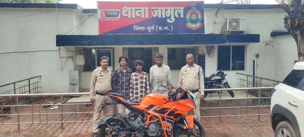 दुर्ग । जामुल थाना क्षेत्र के आम्रपाली कॉलोनी गेट के सामने सड़क पर हुई झपटमारी की घटना का पुलिस ने खुलासा कर दिया है। इस मामले में तीन आरोपी और एक विधि से संघर्षरत बालक को गिरफ्तार किया गया है। आरोपियों के कब्जे से चार मोबाइल फोन और घटना में प्रयुक्त केटीएम बाइक जब्त की गई है, जिसकी अनुमानित कीमत ₹1,45,000 है।