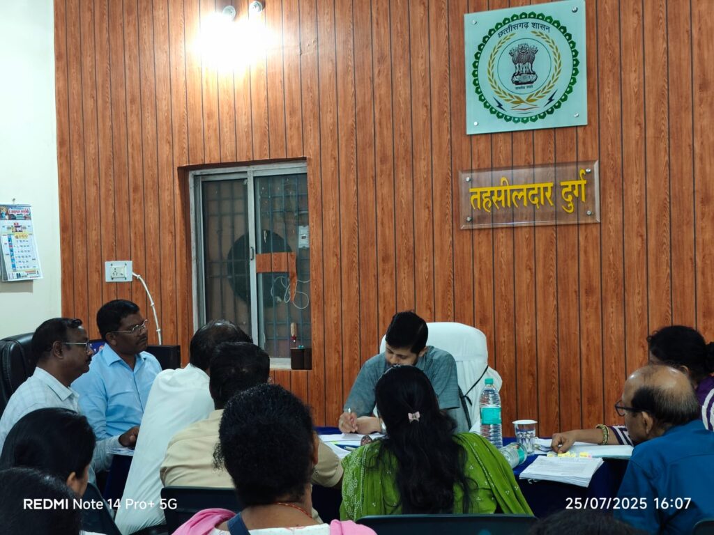 दुर्ग, । कलेक्टर अभिजीत सिंह ने कल तहसील कार्यालय दुर्ग में आयोजित बैठक में राजस्व अधिकारियों, राजस्व निरीक्षकों एवं पटवारियों को भुइयां रिकॉर्ड शुद्ध रखने हेतु विशेष अभियान चलाने के निर्देश दिए। बैठक में लंबित प्रकरणों जैसे खसरा संकलन, विलोपन, शून्य रकबा, नक्शा बटांकन, स्वतः नामांतरण, डीएससी सत्यापन, कृषक पंजीयन आदि विषयों पर विस्तृत समीक्षा की गई।