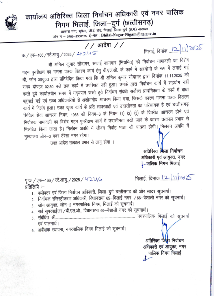 भिलाई नगर। अनिल कुमार सौदागर, सफाई कामगार (नियमित) को निर्वाचन नामावली का विशेष गहन पुनरीक्षण का गणना पत्रक वितरण कार्य हेतु बी.एल.ओ. के फार्म में सहयोगी के रूप में ड्यूटी लगाई गई थी, जोन आयुक्त द्वारा प्रतिवेदित किया गया कि अनिल कुमार सौदागर द्वारा 11 नवंबर 2025 को समय दोपहर 02ः50 बजे तक कार्य में उपस्थित नही हुआ। उनके द्वारा निर्वाचन कार्य में सहयोग नहीं करते हुये कार्यालयीन समय में मद्यपान करते हुये निर्वाचन संबंधी सर्वोच्च प्राथमिकता के कार्य में बाधा पहुंचाई गई एवं उच्च अधिकारियों से अशोभनीय आचरण किया गया है । जिसके कारण गणना पत्रक वितरण कार्य में विलंब हुआ। उक्त कृत्य कार्य के प्रति लापरवाही एवं उदासीनता का परिचायक है एवं छत्तीसगढ़ सिविल सेवा आचरण नियम, 1965 की नियम-3 के नियम (1) (2) (3) के विपरीत आचरण होने एवं निर्वाचक नामावली का विशेष गहन पुनरीक्षण कार्य में उदासीनता बरते जाने के कारण तत्काल प्रभाव से निलंबित किया गया है। निलंबन अवधि में जीवन निर्वाह भत्ता की पात्रता होगी। निलंबन अवधि में मुख्यालय जोन-3 मदर टेरेसा नगर रहेगा।