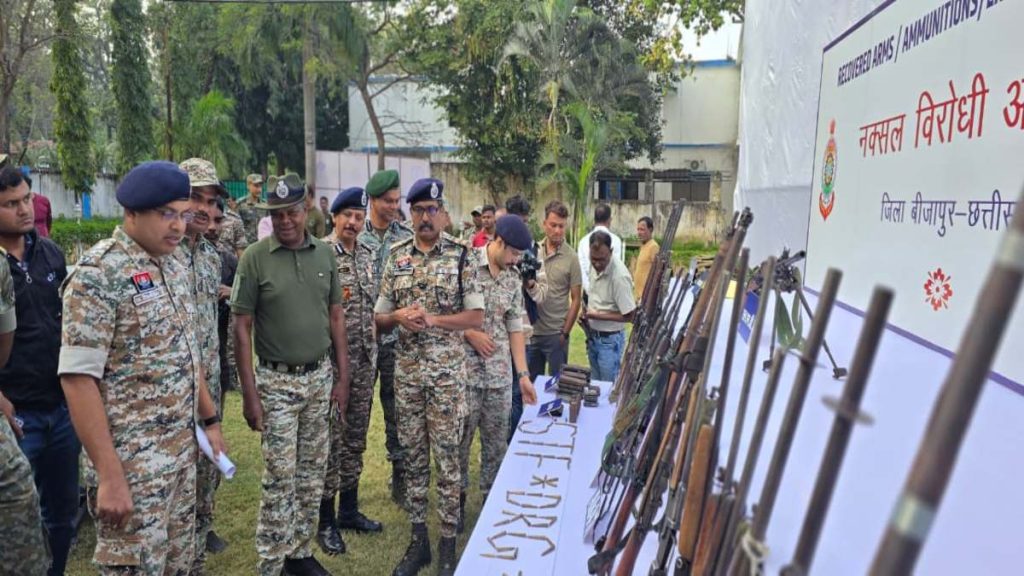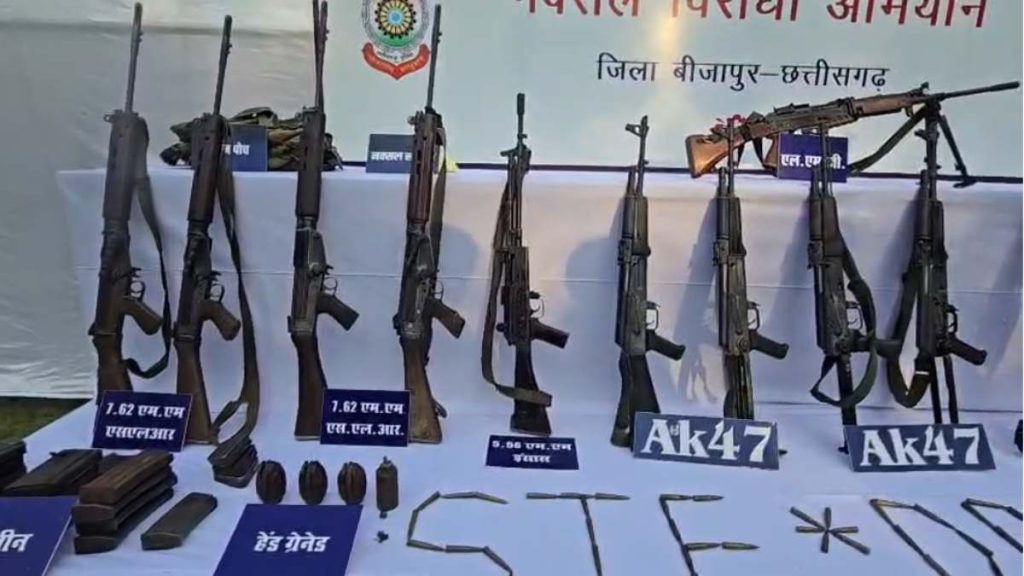 मुठभेड़ स्थल से भारी मात्रा में हथियार बरामद किए गए हैं, जिनमें AK-47 रायफल, LMG, 303 रायफल और अन्य स्वचालित हथियार शामिल हैं।