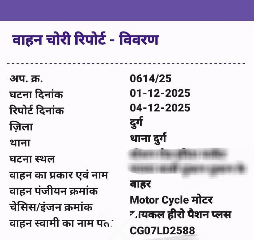 वाहन: हीरो पैशन प्लस मोटरसाइकिल, क्रमांक CG07LD2588