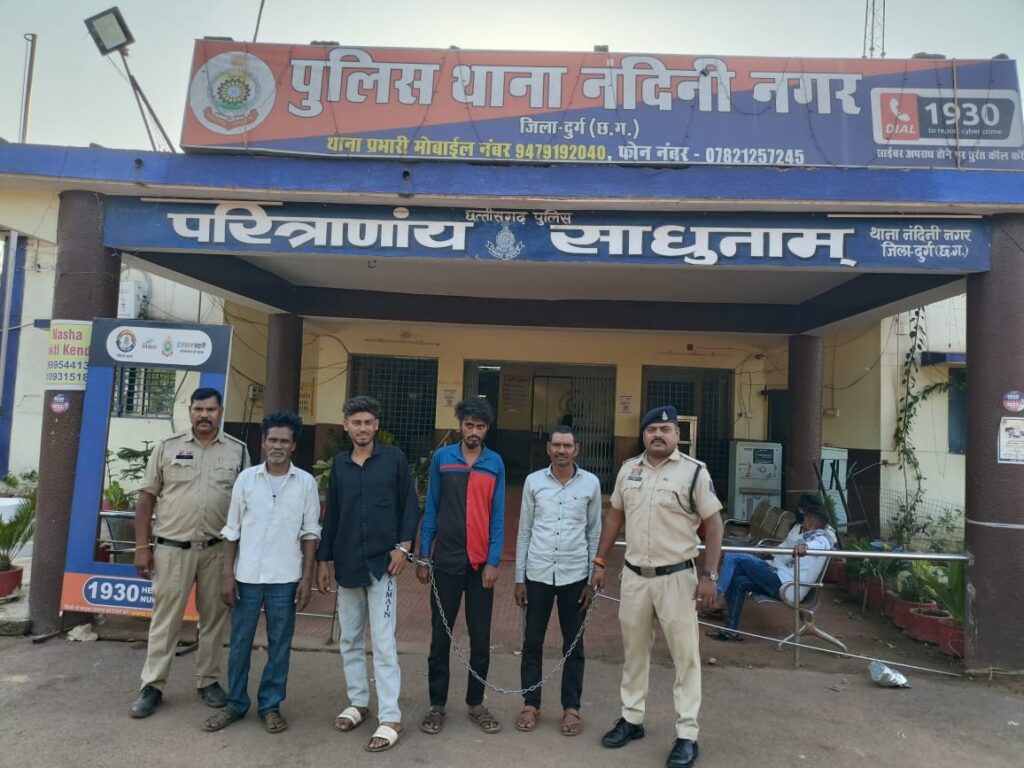 दुर्ग। थाना नंदिनी नगर क्षेत्र में दुर्ग पुलिस ने अवैध शराब के परिवहन के खिलाफ बड़ी कार्रवाई करते हुए 5 आरोपियों को गिरफ्तार किया है। पुलिस ने आरोपियों के कब्जे से 134 पौवा देशी शराब और 3 मोटरसाइकिल सहित कुल 1,03,400 रुपये की सामग्री बरामद की है।पुलिस को 14 और 15 अप्रैल 2026 को मुखबिर से सूचना मिली थी कि क्षेत्र में अवैध रूप से शराब का परिवहन किया जा रहा है। सूचना के आधार पर पुलिस टीम ने अलग-अलग स्थानों पर घेराबंदी कर कार्रवाई की।पहली कार्रवाई में बीएसपी मेनगेट के पास एक आरोपी को मोटरसाइकिल में 42 पौवा देशी शराब के साथ पकड़ा गया। दूसरी कार्रवाई में पथरिया रोड स्थित ग्राम पाटिया तिराहा के पास 2 आरोपियों को 60 पौवा शराब सहित गिरफ्तार किया गया। वहीं तीसरी कार्रवाई में अन्य 2 आरोपियों को 32 पौवा शराब के साथ पकड़ा गया।तीनों मामलों में आबकारी एक्ट के तहत अलग-अलग प्रकरण दर्ज कर सभी आरोपियों को गिरफ्तार कर न्यायिक रिमांड पर केंद्रीय जेल दुर्ग भेजा गया है।
