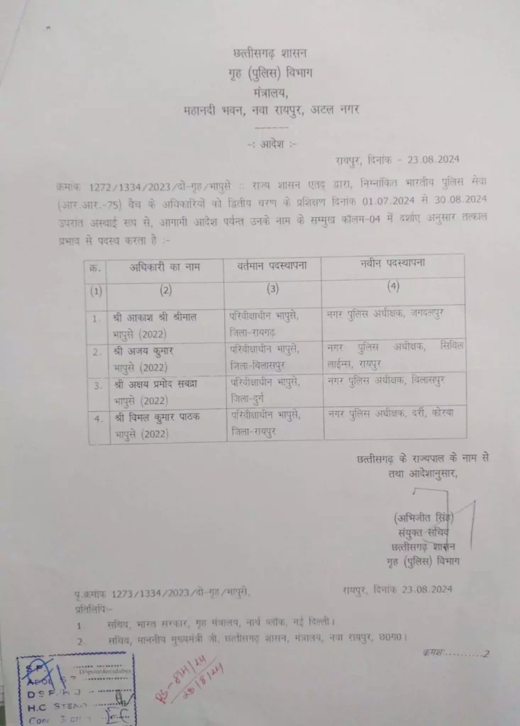 रायपुर । छत्तीसगढ़ में 2022 बैच के 4 परिवीक्षाधीन भारतीय पुलिस सेवा (IPS) अधिकारियों को अलग-अलग जिलों में पदस्थापित किया गया है। गृह विभाग की ओर से जारी आदेश के अनुसार, ये अधिकारी निम्नलिखित पदों पर पदस्थापित किए गए हैं: