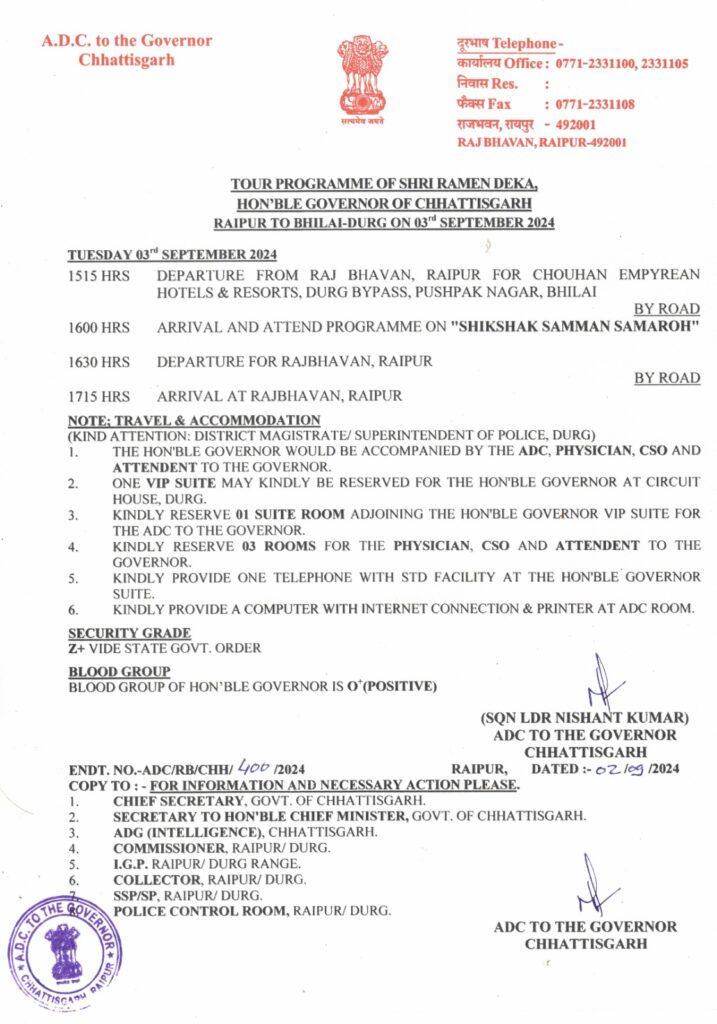 दुर्ग l महामहिम राज्यपाल रमेन डेका 03 सितम्बर को भिलाई प्रवास पर रहेंगे। इस दौरान वे शिक्षक सम्मान समारोह में मुख्य अतिथि के रूप में शिकरत करेंगे। प्राप्त जानकारी के अनुसार राज्यपाल डेका 03 सितम्बर 2024 को अपरान्ह 3.15 बजे सड़क मार्ग द्वारा राजभवन रायपुर से प्रस्थान कर अपरान्ह 4.00 बजे चौहान इम्पेरियन हॉटल रिसार्ट दुर्ग बायपास रोड पुष्पक नगर भिलाई पहुंचेंगे। महामहिम यहां पर शिक्षक सम्मान समारोह में शिरकत करेंगे। कार्यक्रम पश्चात् राज्यपाल श्री डेका अपरान्ह 4.30 बजे सड़क मार्ग द्वारा राजभवन रायपुर के लिए प्रस्थान करेंगे।