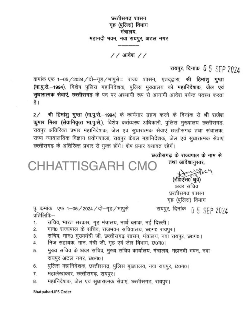 हिमांशु गुप्ता को महानिदेशक, जेल एवं सुधारात्मक सेवाएं के पद पर पदस्थ किया गया है। इस जिम्मेदारी के साथ ही उन्हें राज्य की जेलों में सुधारात्मक कार्यों को लागू करने की बड़ी चुनौती मिली है।