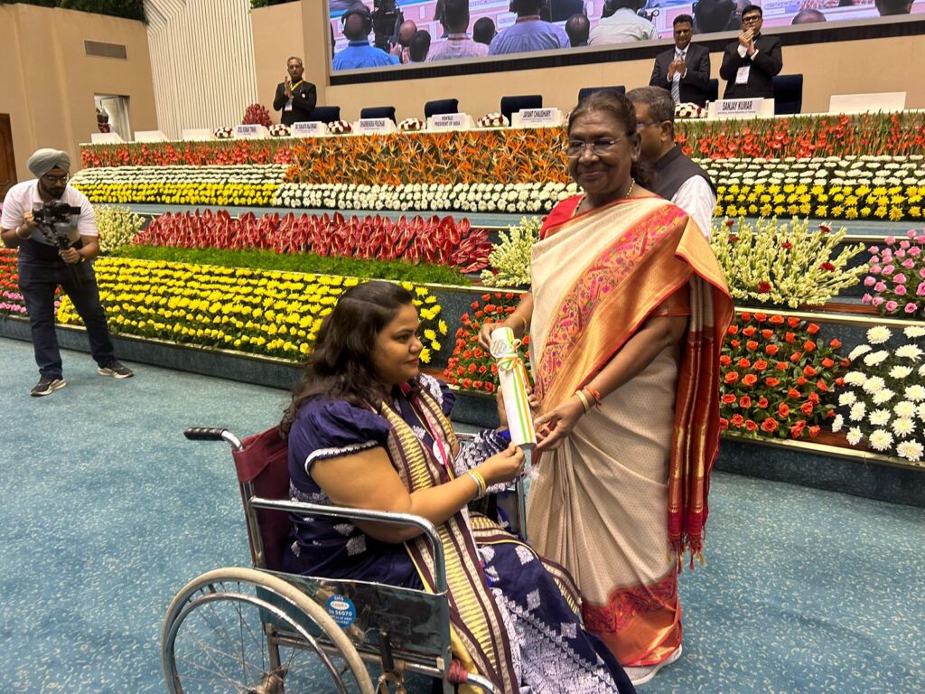 गोविंदा चौहान । भिलाई. । राष्ट्रपति द्रौपदी मुर्मू ने शिक्षक दिवस पर देश भर के शिक्षकों को सम्मानित किया, जिसमें भिलाई के खेदामारा मिडिल स्कूल की दिव्यांग शिक्षिका के. शारदा भी शामिल हैं।